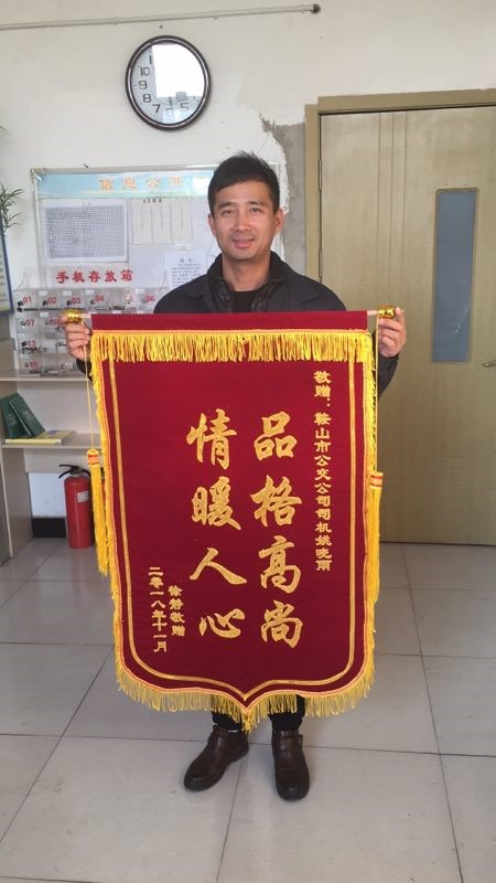 1、2018年11月16日,來了一名叫徐靜女士拿著一面錦旗來到了客運十一隊35路快線調(diào)度室,向4110819號車駕駛員姚曉宇師傅拾金不昧的行為表示感謝。11月2日下午16點50分,她乘坐35路快時將一藍(lán)色布袋(內(nèi)有公章及各種證件)遺落在車上,隨后被駕駛員姚曉雨拾到,及時聯(lián)系失主并歸還。